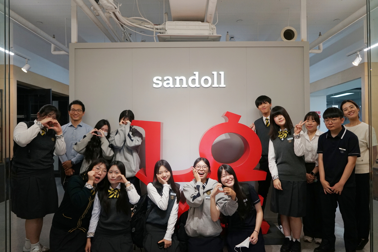 한글날을 맞아 진행된 ‘산돌 인스파이어 투어’에 참여한 미림마이스터고등학교 뉴미디어디자인과 학생들과 교사가 산돌 관계자와 함께 기념촬영을 하고 있다.